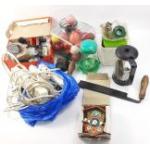 A small mixed lot to include a jar of snooker balls, a quantity of picture hooks, bird feeder, quantity of door bolts, extension cables, small cuckoo clock, cafetiere