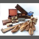 Mixed box to include a wooden shoe shine box, several vintage shoe stretchers, 2 onyx book ends, dressage crop and several other boxes