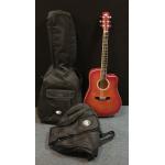 A LORENZO flame series guitar with deep, rich red body, light wear to the frets, nice and straight, within soft sided carry case, plus one extra soft case