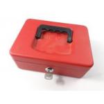 A red HELIX lockable money box with original key and interior tray, 20x15cm approx