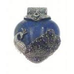 A silver pendant stamped 925 TGGC with a silver peacock with purple stones in his tail encapsulating a large blue stone 5cm length approx