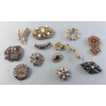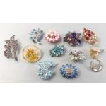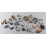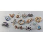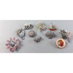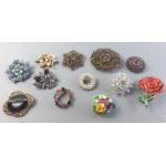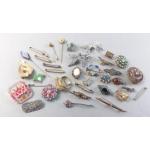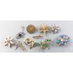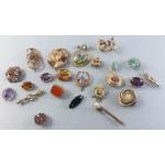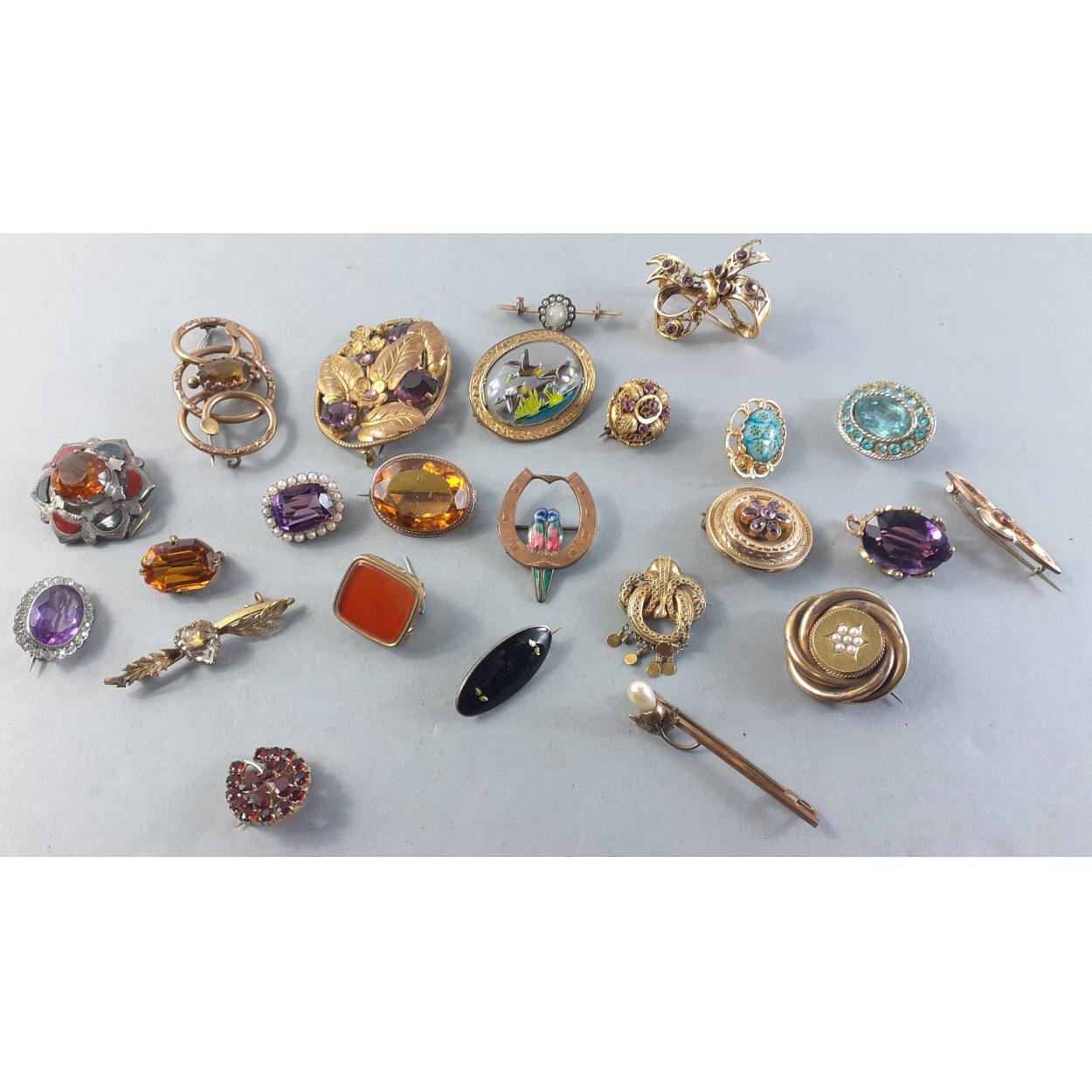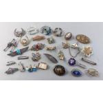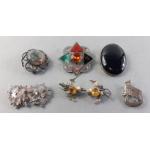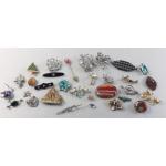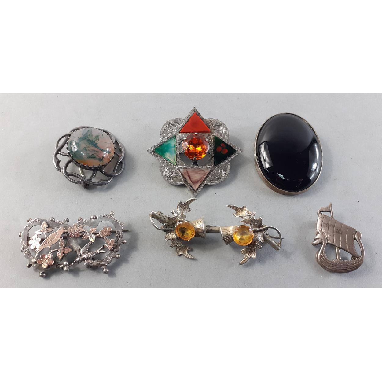 A splendid collection of quality vintage jewellery pieces to include Scottish shield style brooch pin with Cairngorm centre. A hardstone mounted brooch, a kilt pin style brooch with indistinct mark, a small Sterling thistle pin with wear and other silver items including 1933 half crown