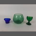 A VIBRANT lot of Vintage glass to include an ANTIQUE APOTHECARY blue OPTREX SIGHT glass 5.2cm wide as well as two green glass wares 6cm wide and 4.1cm wide and a small paperweight. All good condition