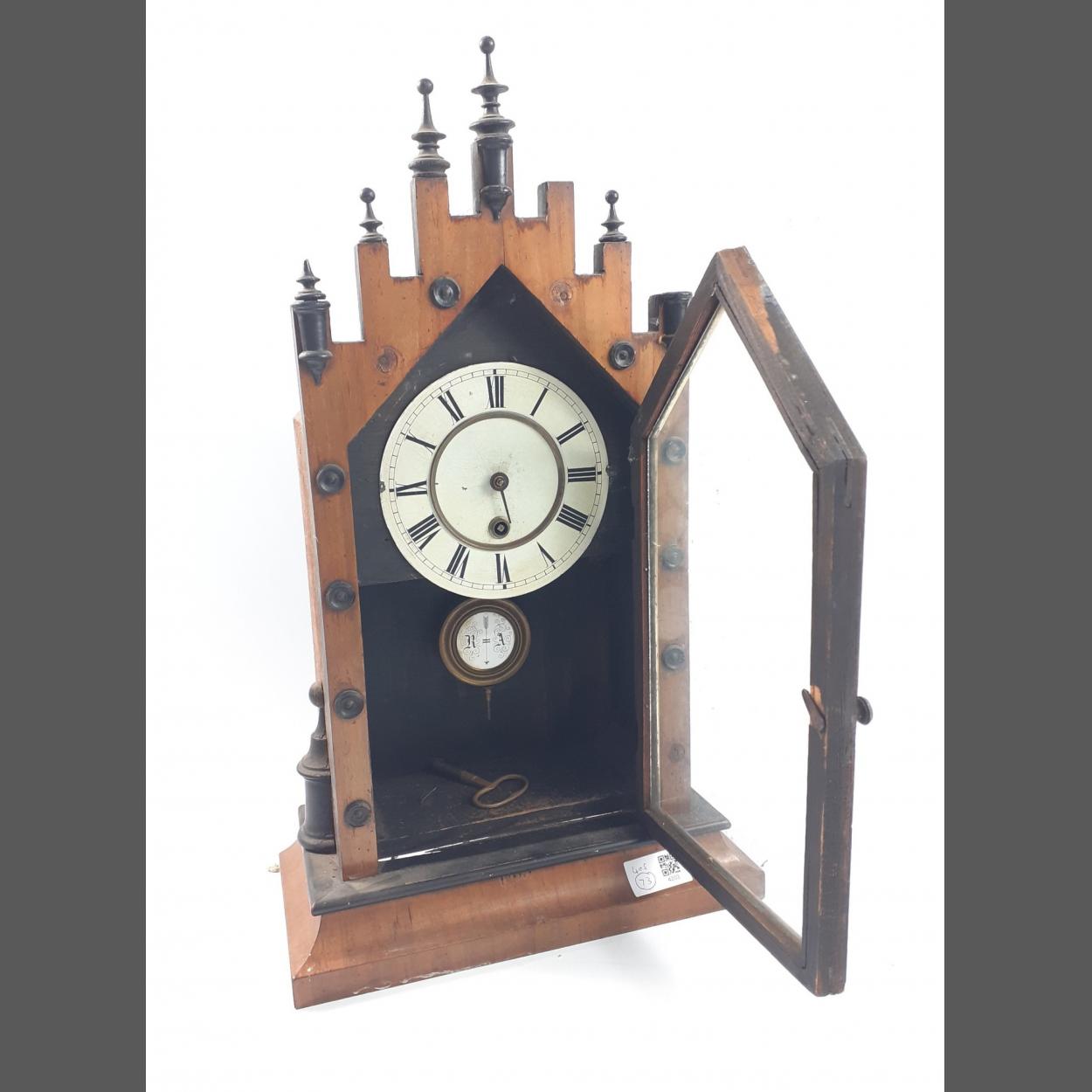 A FABULOUS wooden mantle clock , complete with key. Dimensions - 49.2cm tall, 28.1cm long. Condition - A couple of the wooden pieces on the top are missing as well as another top of the wooden piecese has broken off. Two of the circle pieces have also broken off from the front of the clock. Still a fantastic clock!