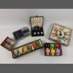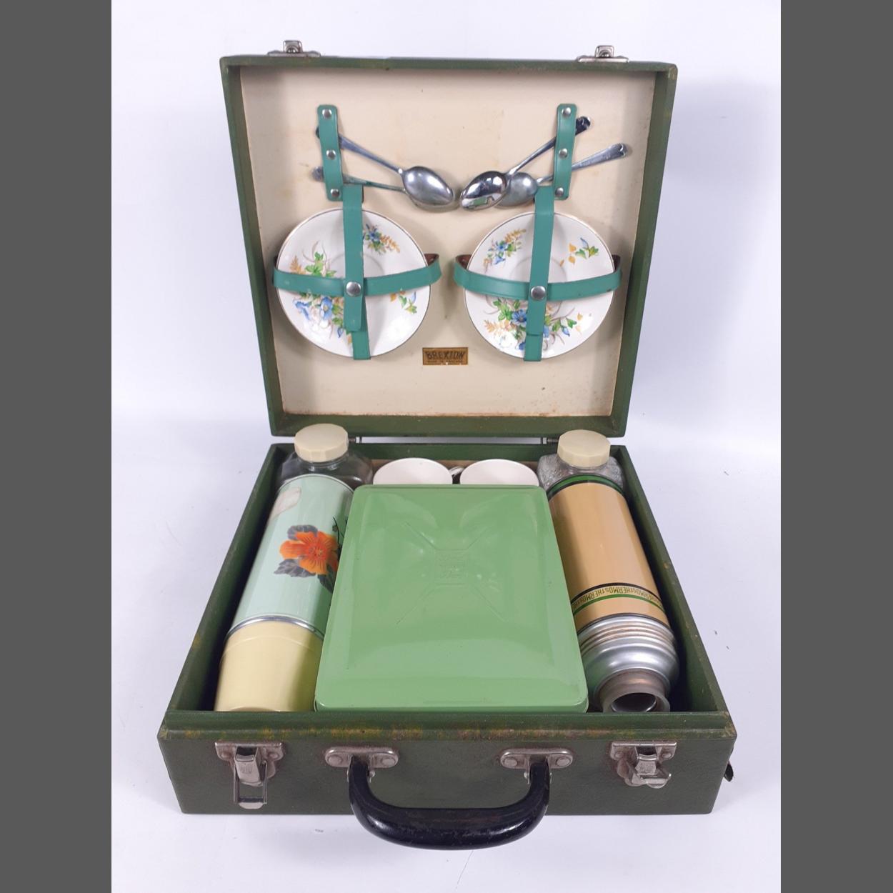 A vintage BREXTON picnic case including 2 cups, 4 saucers, 4 teaspoons, 2 vacuum flasks, one by THERMOS, 2 glass jars for sugar and tea and a tin for sandwiches