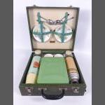 A FANTASTIC Green vanity set with a washed satin inner lining, although incomplete, the vanity set is of exceptional quality. Includes brush, comb, two bottles, mirror and nail files. Height 20.3 cm, width 28.5 cm.