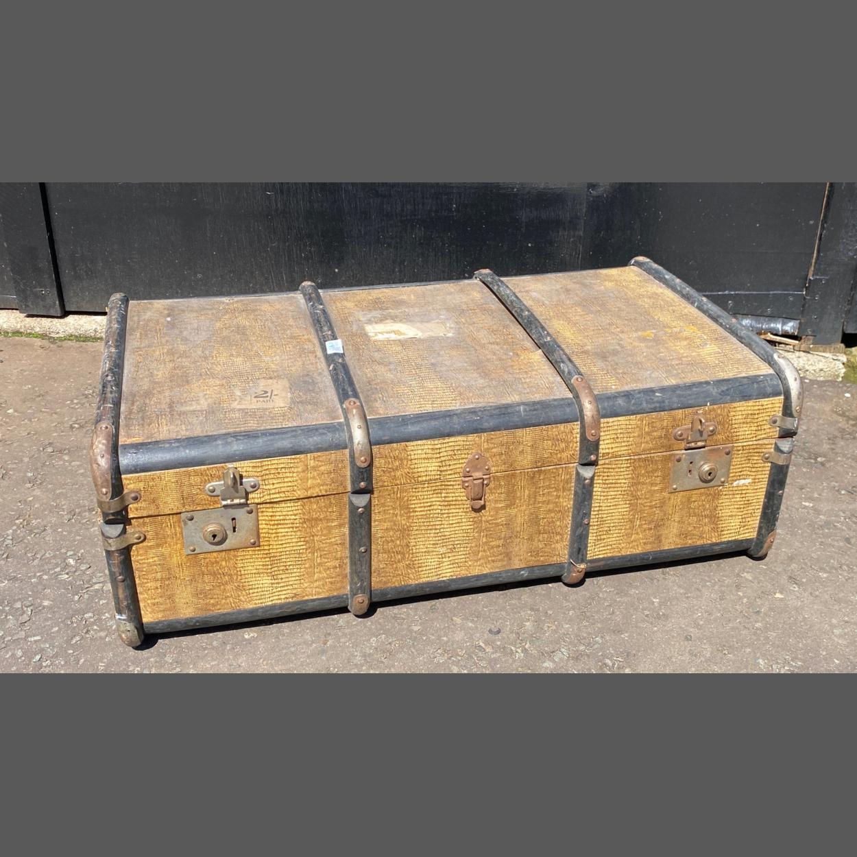 A vintage trunk (90Lx 30Hx53Dcm) with mock crocodile skin cover, wooden bands and white metal edging, complete with vintage railway luggage labels from the London and North East Railway and initials D.G>