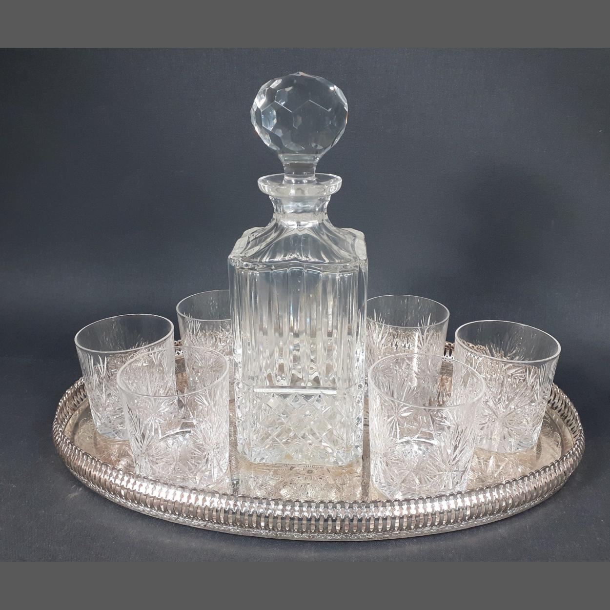 CRYSTAL decanter with a set of 6 CRYSTAL WHISKY glasses on an oval gallery tray (38cm), the decanter stands 20cm tall and has a small chip near the base, the stopper is missing part of the bottom, the glasses are 7cm tall with no visible damage,