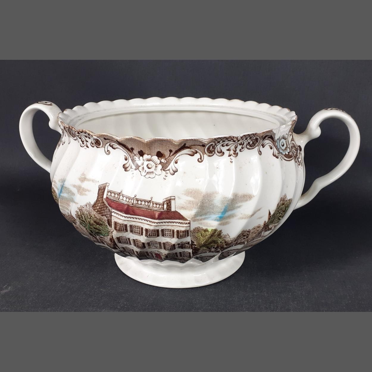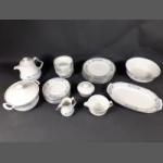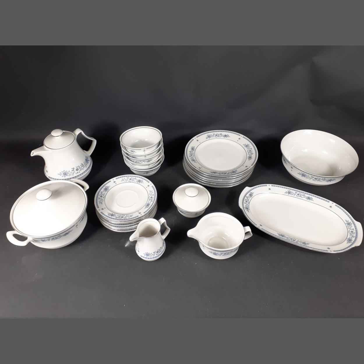 Vintage to include 6 bowls (13cm), 6 plates (17cm), 6 plates (23cm), 1 sauceboat with underplate, 1 serving bowl (23cm dia), 1 ashet (32cm approx), 1 milk jug, 1 lidded sugar bowl, 1 teapot, 1 lidded tureen ( 18cm dia),