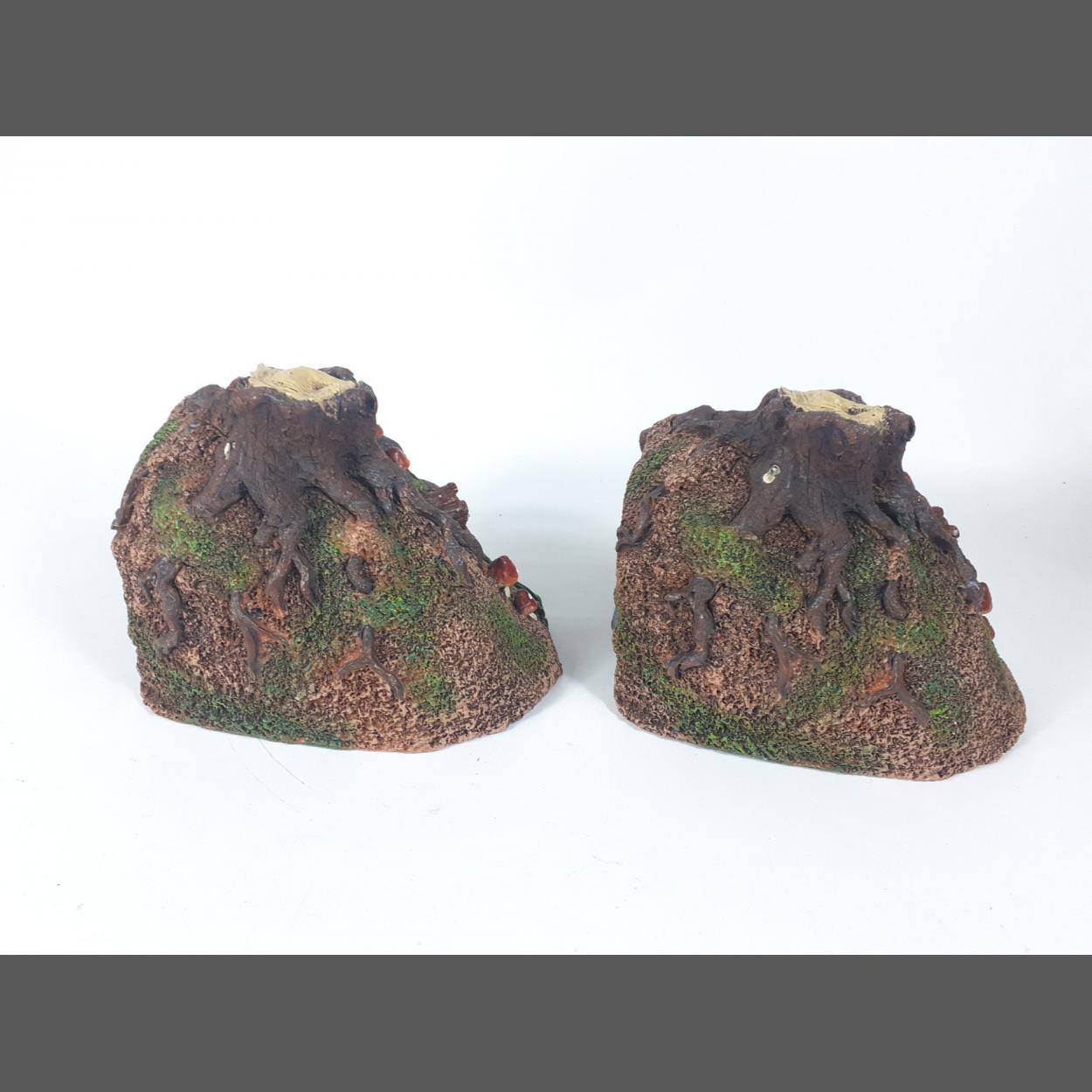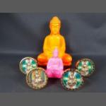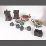 A selection of miniature mining items including a brass PROTECTOR LAMP (12cm tall), two BRASS FIGURES (10cm tall) and two small COAL AND RESIN figures largest 13cm tall