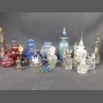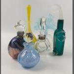 A collection of three fragile Middle Eastern glass perfume bottles, the tallest being 17cm high approx, plus some more substantial bottles from VILLAGE GLASS (13cm), DARTINGTON (11cm), a JENNY BLAIR bottle with a dragonfly design (9cm tall approx), a rainbow MURANO bottle (11cm tall approx), a TOUCH OF GLASS (18cm tall) and a small blue vase hand-made in Cyprus with a silver-plate overlay (11cm tall approx) etc