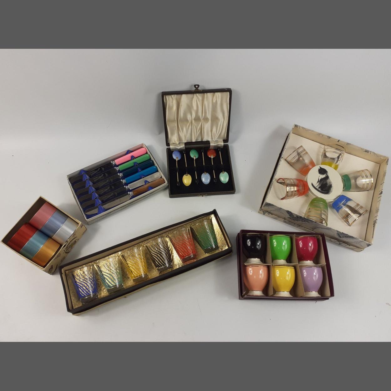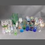 Colourful glassware to include 6 highball glasses, 6 sherry glasses, 6 hock glasses, 6 wine glasses with engraved flowers, 2 further hock glasses, 4 sundae glasses, 2 small blue beakers and a large green jug (25cm tall) etc