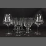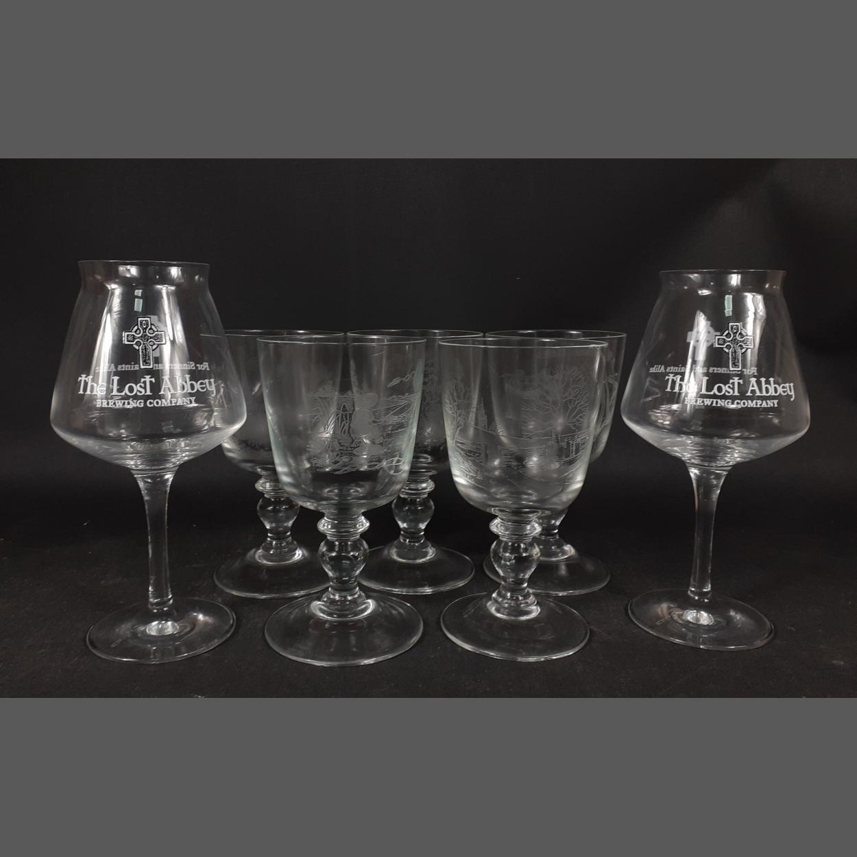 A set of five large glass goblets engraved with pastoral scenes each 16cm high plus 2 large goblets from The Lost Abbey Brewing Company