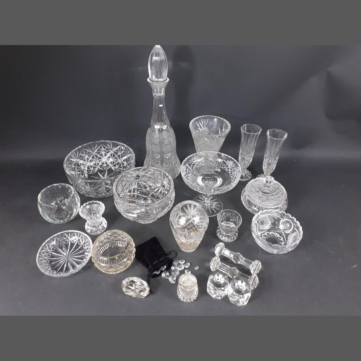 A mixed lot of glassware to include a fruit bowl (20cm dia), a rose bowl (15cm), a large decanter, candlesticks etc