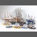 SHIP AHOY ! A collection of 12 wooden model boats, largest 32cm approx. Trawl the nets, you will not find a better fleet.