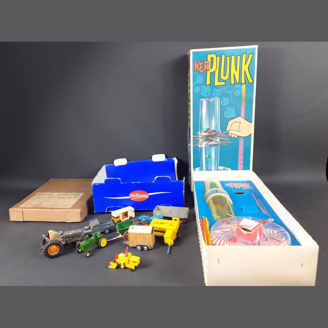 A mixed lot to include the vintage game KERPLUNK, a small box of playworn farm vehicles