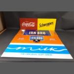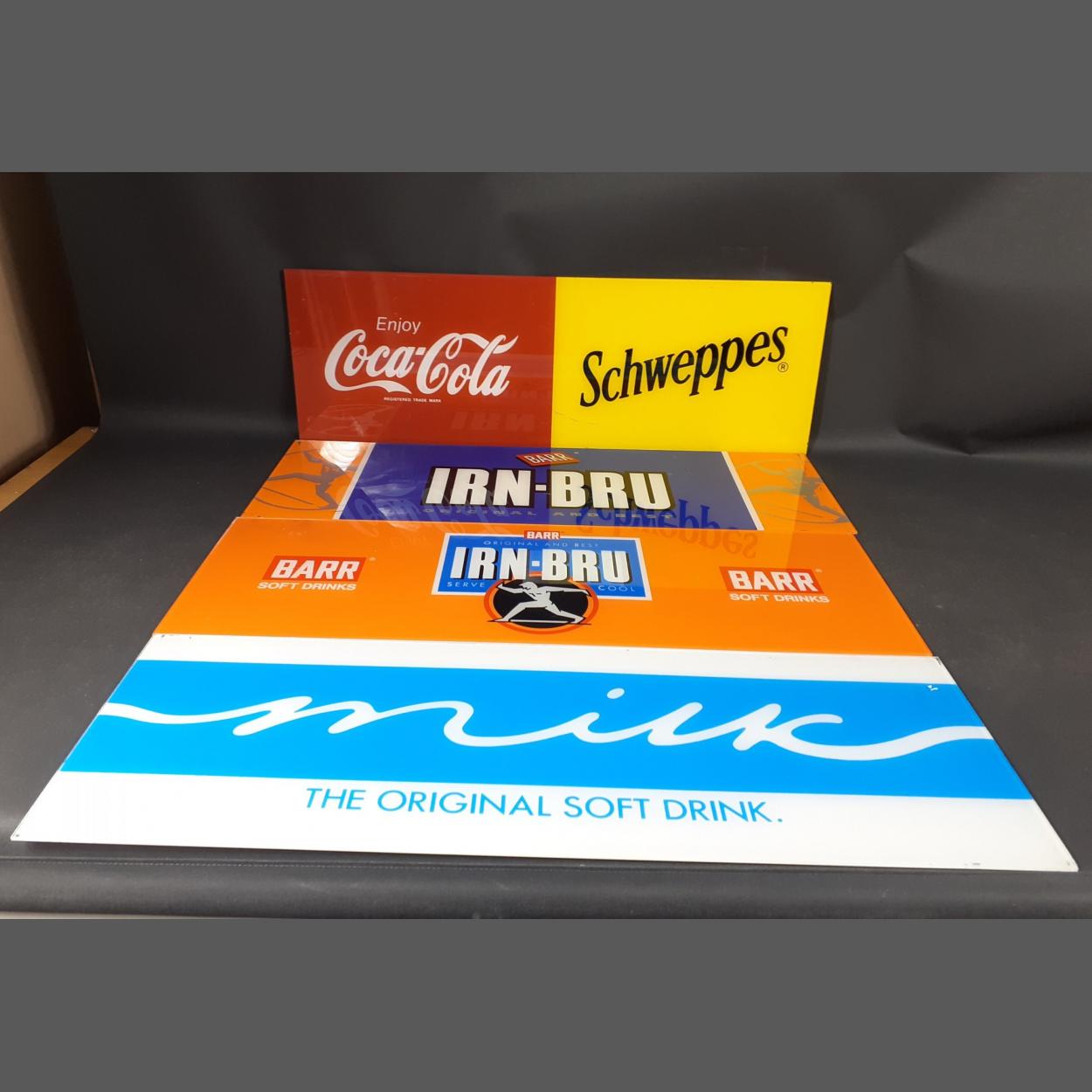 Four Perspex signs for the man cave, each 74x25cm approx to include 'Milk the original soft drink', 'Enjoy Coca-Cola/Schweppes, 'Irn-Bru' - one with blue and the other with orange background