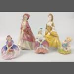 A collection of beautiful glass perfume bottles to include one clear glass with turquoise stopper (16cm high) by DESNA, a JENNY BLAIR green with clear glass design of a face and stopper (18cm tall approx), a mainly yellow piece in MDINA glass (19cm approx), a clear glass bottle and stopper with white metal stopper (14cm tall approx), a MARTIN and YEATES iridescent glass perfume bottle with a clear glass stopper (14cm high) and a CAITHNESS lavender swirl perfume bottle with stopper (11cm high approx).