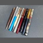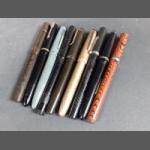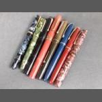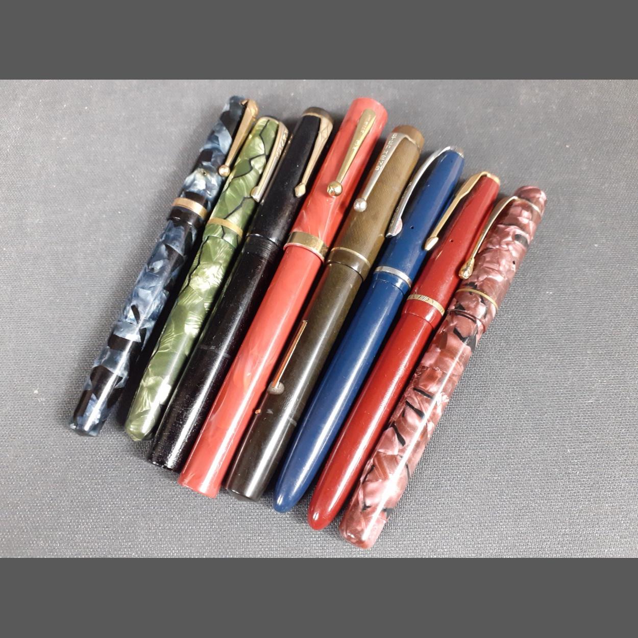 Vintage fountain pens. 8 in total to include, Burnham green marble with 14ct nib, Nova Red marble, Swan Mabie Todd self filler in grey blue marble with 14ct nib, Shaeffer USA in red, Parker Slimfold in red with 14k nib, Watermans ideal in black, Stephens Leverfil No. 106 with 14ct nib and a Platignum in blue.