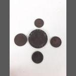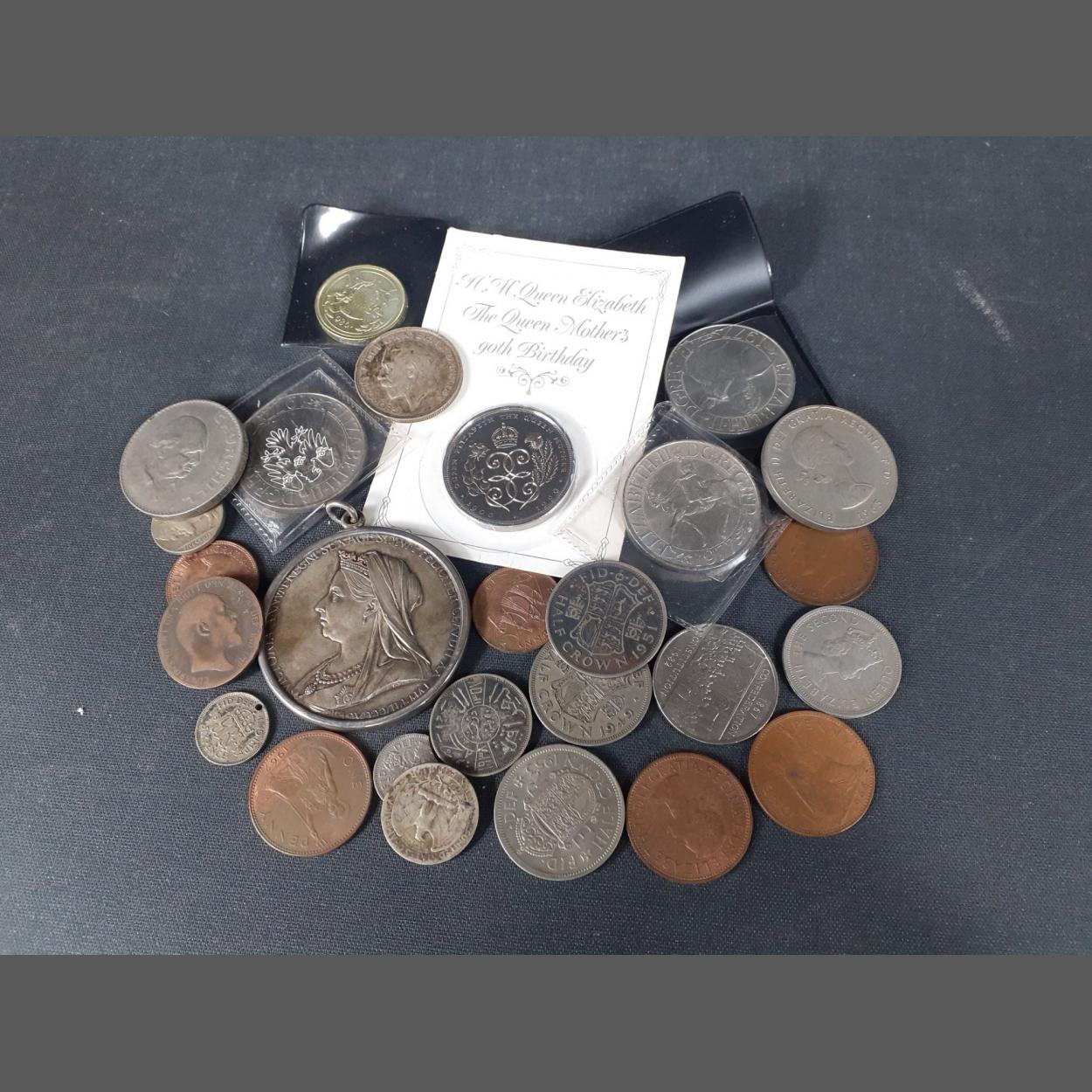 Assorted coins mostly UK including crowns and a large old head Queen Victoria base metal medallion in a mount.
