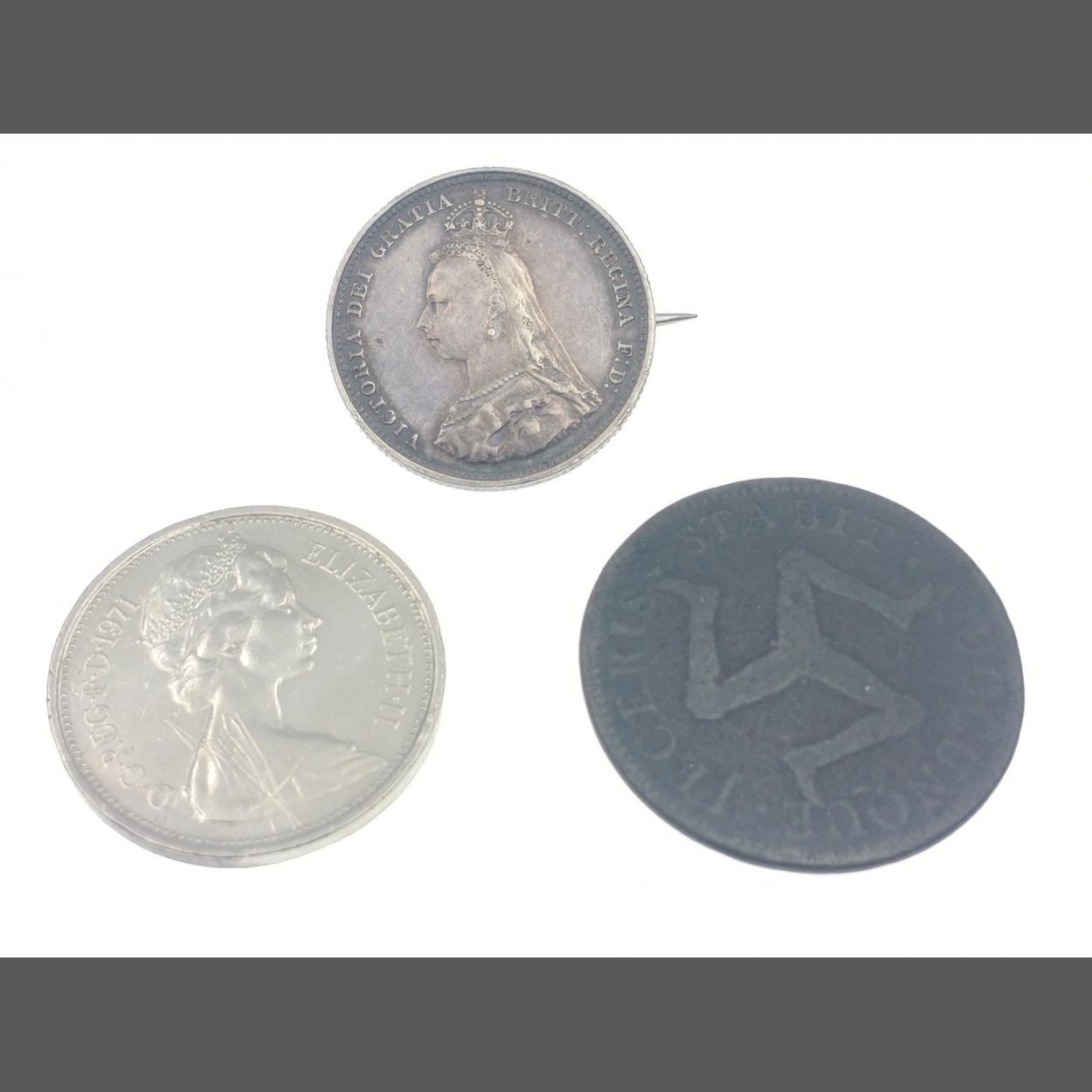 A Victoria coin pin badge (1888), and Isle of Man penny (1758) and a silver 2 pence piece (1971)