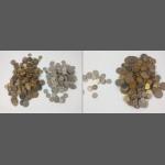 A large collection of UK coins to include a bag of post WWll George Vl one shilling coins, a small bag of sixpences, and two large bags of pennies, halfpennies, farthings, threepenny bits, some dating back to the reign of Queen Victoria