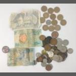 ITS A FRENCH LOT! A 50 Franc Banknote 1982(corner edge torn and folded in several places) with twelve 10 Francs coins and a silver 1 franc coin , with also BRITISH coins to include also an 1834 William lV silver sixpence, vintage 20th century British coinage, two shilling coins, one Penny coins Victoria etc and Florin coins etc, also Two 100 Escudos bank notes(in used worn condition) etc