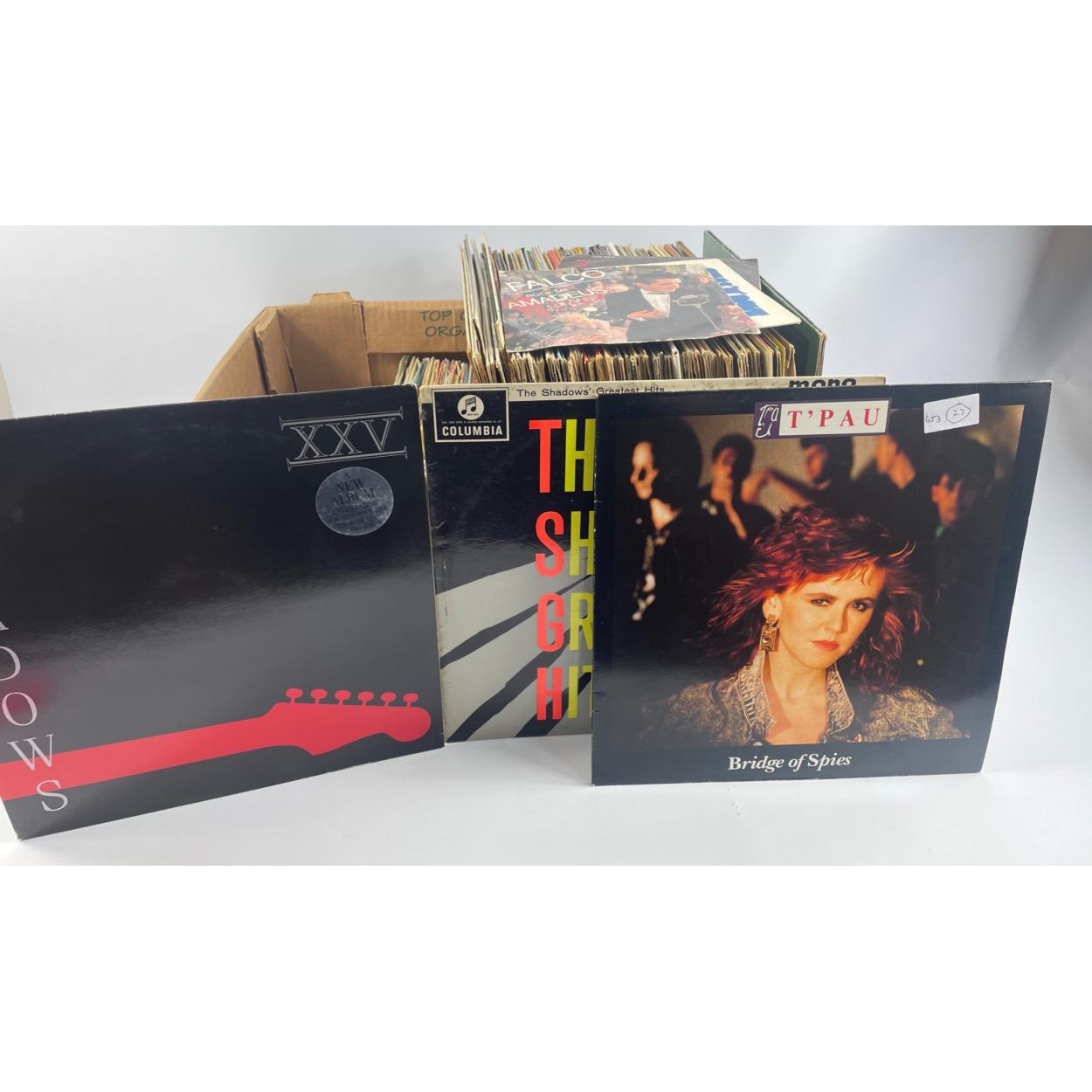 A LARGE mixed-genre box OF LPs to include 'White Christmas' by BING CROSBY, 'The Shadows', 'The Shadows Greatest Hits', 'Bridge of Spies' by T'PAU' and 'Elvis' as well as several discs and DVDs.