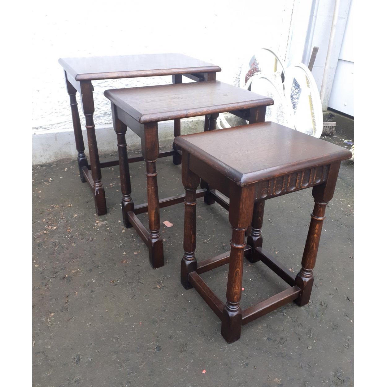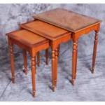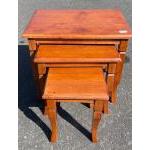 A STYLISH nest of 3 tables. Dimensions - the largest table 48cm tall x 47cm long x 33cm in depth. Medium sized table 44cm tall x 37cm long x 29 cm depth. The smallest 41cm tall x 28cm long x 24cm in depth approx. Slight scratching and stain on leg of largest table.