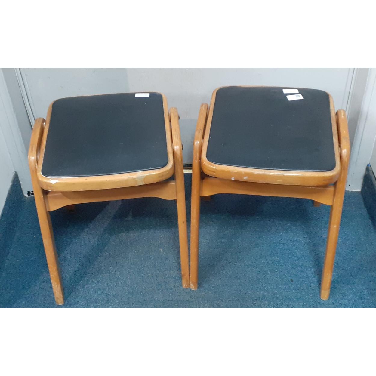 A pair of attractive RETRO wooden framed small stools with vinyl seat pads. 45cm high approx.