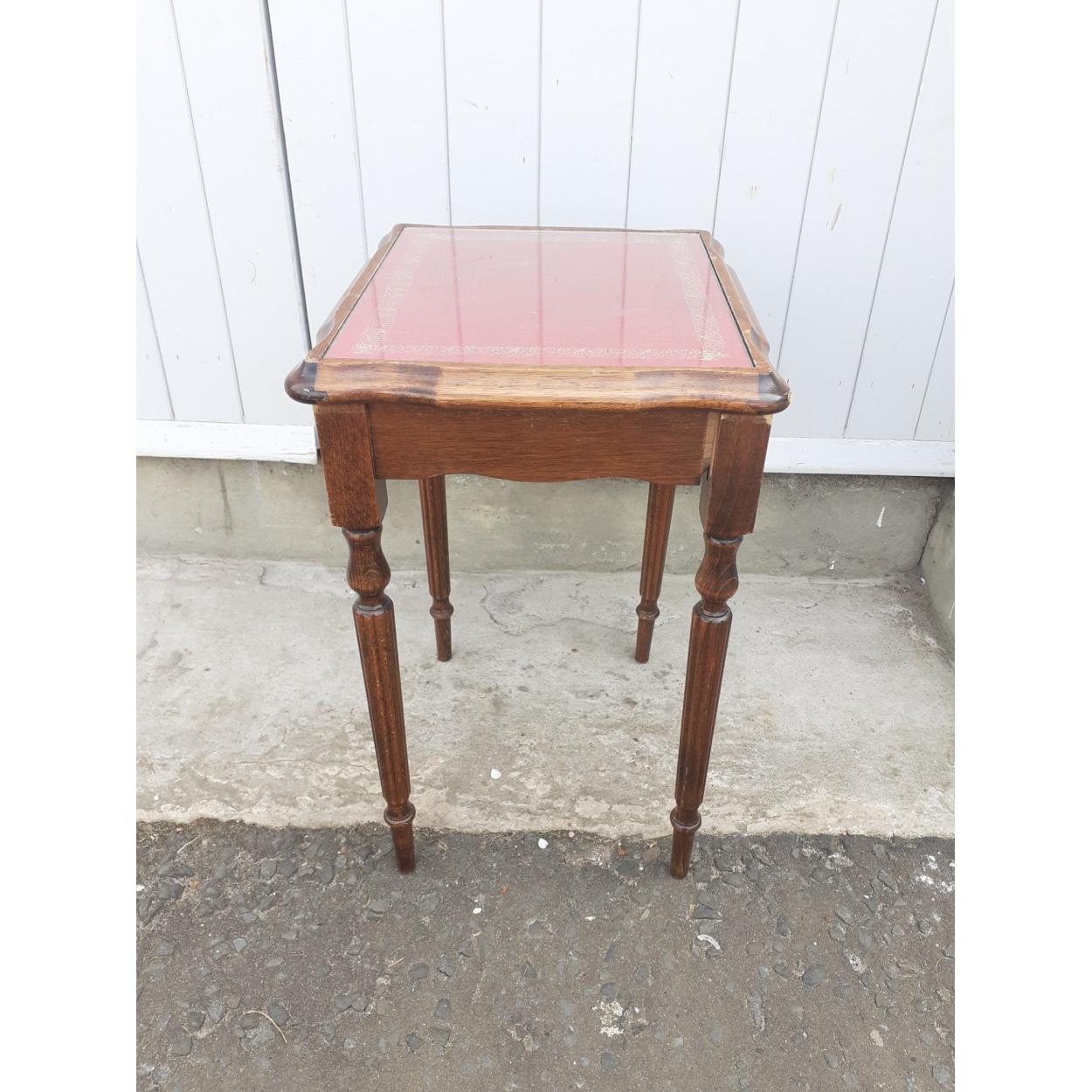 A small wine table with red leather and glass top on four fluted leg supports - dimensions 33cm square x height 47cm approx