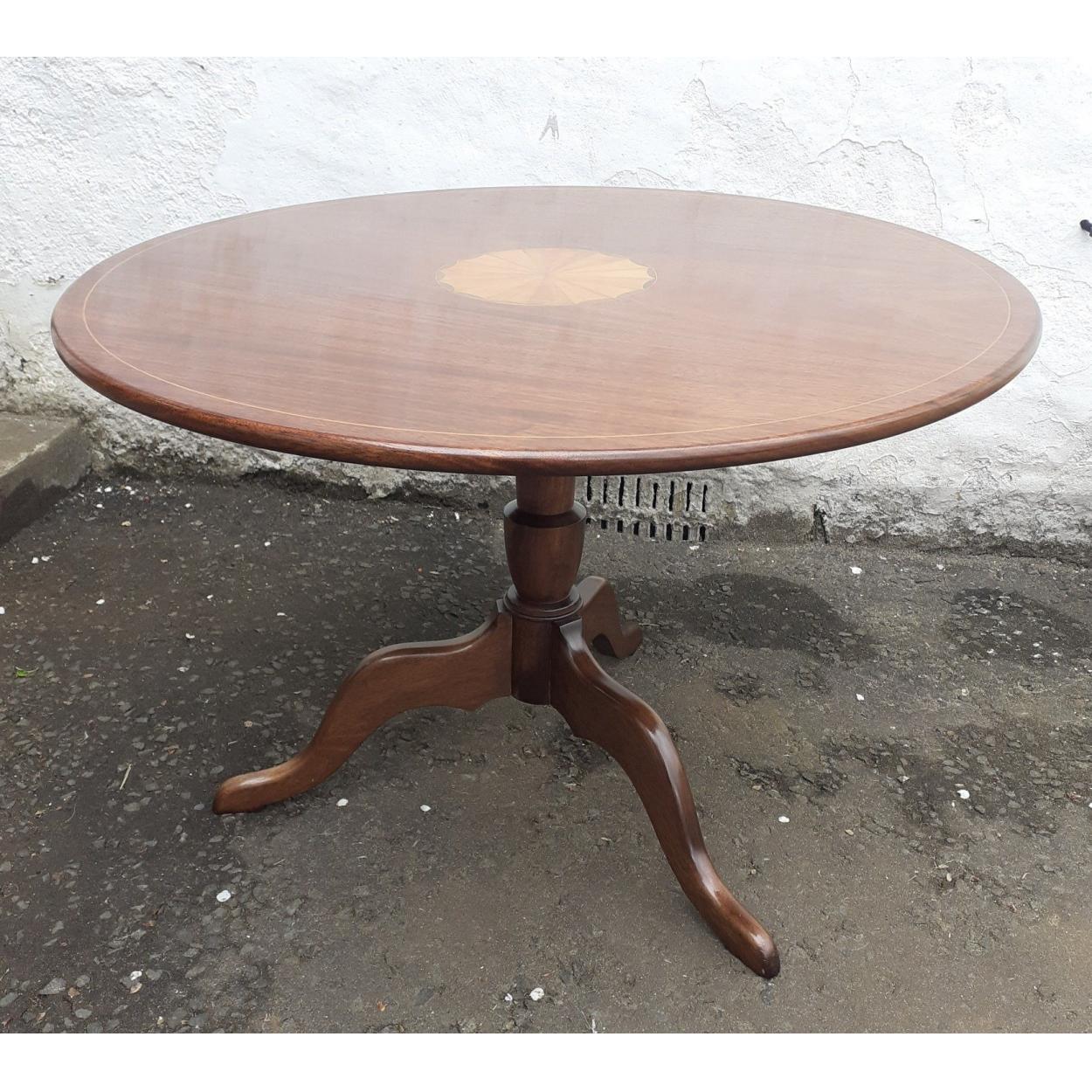 Tilting mahogany inlaid table on tripod support legs - diameter 75cm x height 57cm approx