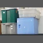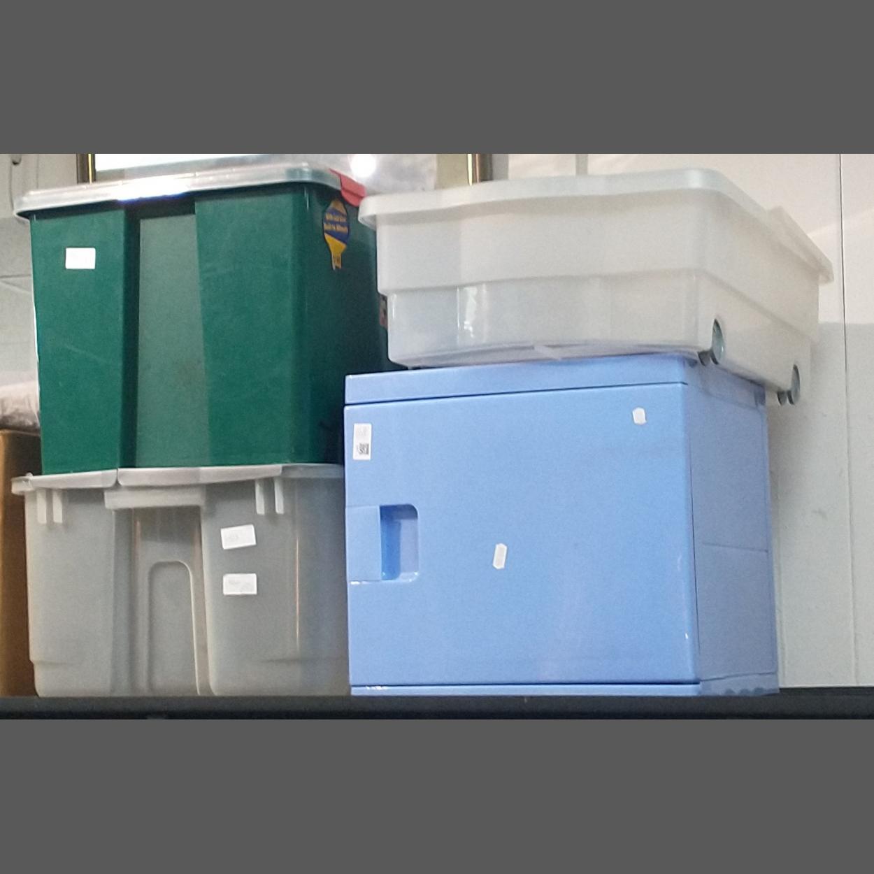 Four handy sized plastic storage boxes to include a top-opening lilac-coloured square shaped box 35x38x38cm - great size for a child's toy box