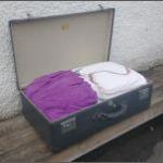 A large Globetrotter suitcase (75x38x25cm approx), filled with bedding to include sheets, blankets and 2 candlewick bedspreads