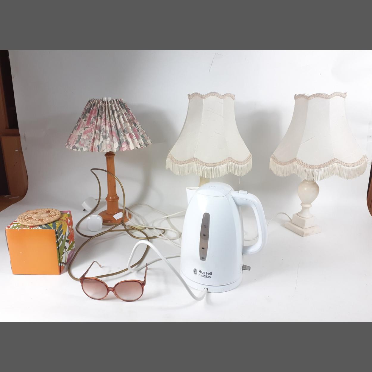 A domestic lot consisting of a pair of table lamps with cream coloured fringed shades (45cm high approx), plus a BHS wooden stemmed lamp with a floral shade (42cm approx) plus a RUSSELL HOBBS 1.7l capacity electric kettle