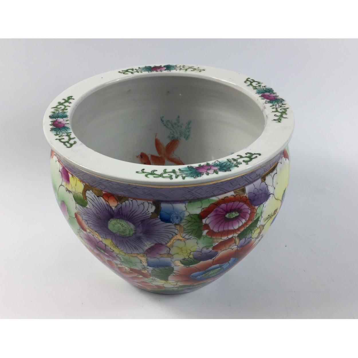 Large oriental floral pattern vase marked Made in China. 17cm high x 22cm diameter. Light wear but no damage.