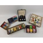 Cheer up the morning breakfast table with these colourful additions - all multi-coloured - a set of six butter knives, 6 Romanian egg cups, 6 napkin rings, 6 enamelled coffee bean spoons, plus 6 shot glasses with coasters, 6 French shot glasses