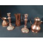 Collection of copper items. Pair of antique candlesticks 24cm high approx a coffee pot style jug, water jug stamped England to base and a tall jug in Arts and Crafts style.