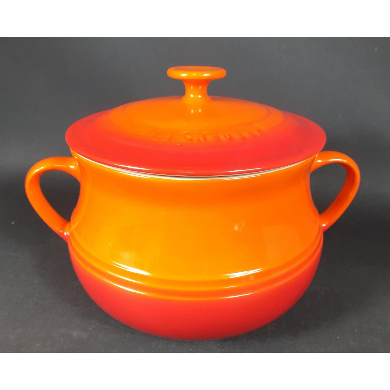 LE CREUSET volcanic orange stoneware casserole dish. Complete with lid and in good condition. 20cm across at neck approx. 16cm high without lid approx.