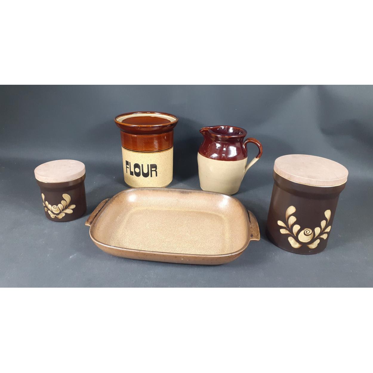 Two vintage DENBY pottery BAKEWELL storage jars 'XL' and 'MD', a DENBY lasagne dish (30cm length approx), plus a retro JOHN HERMANSEN two-tone stoneware flour storage jar and a two-tone PEARSON'S jug (18cm high)