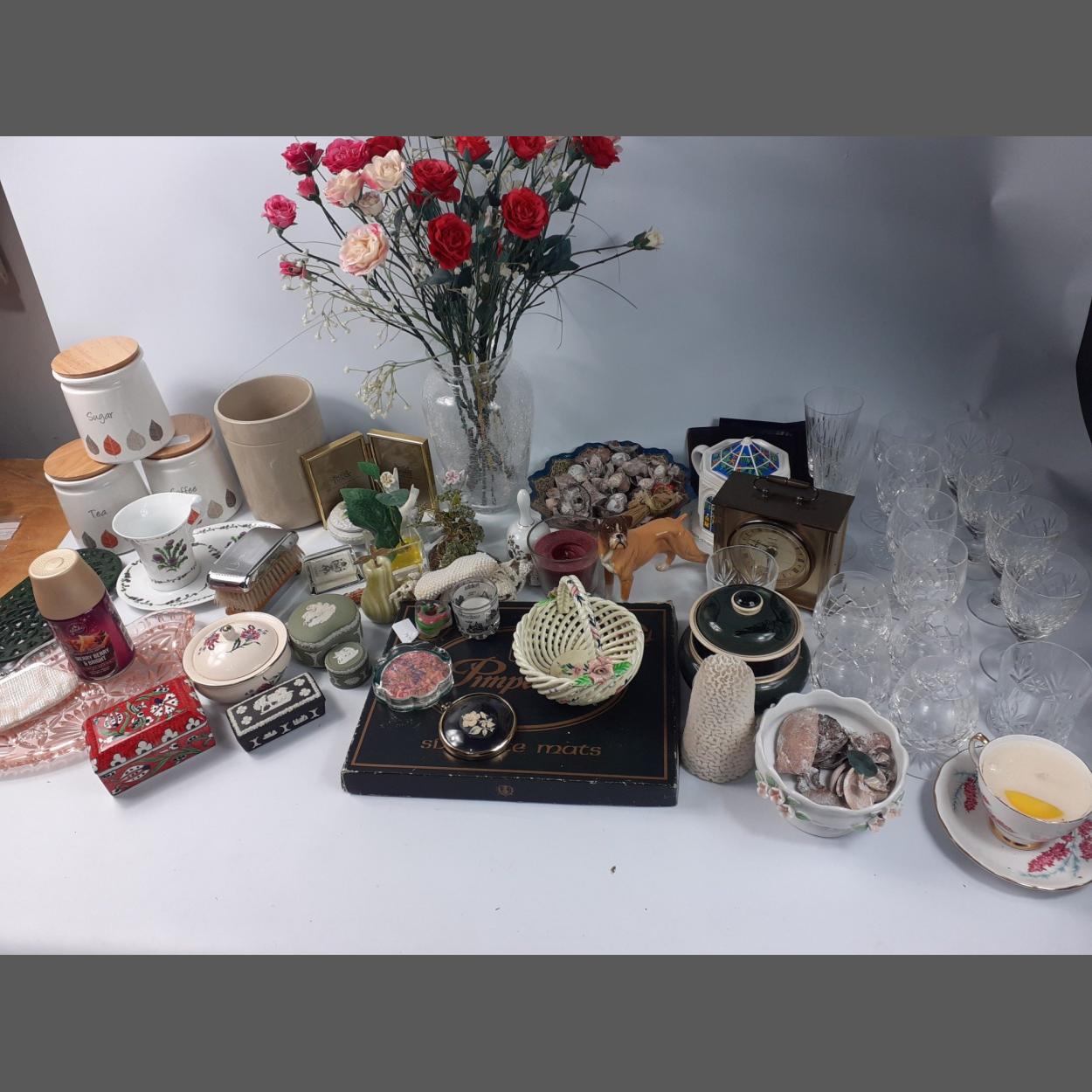 Two boxes of assorted glassware and household objects which includes 14 crystal glasses, place mat set depicting castles and much more