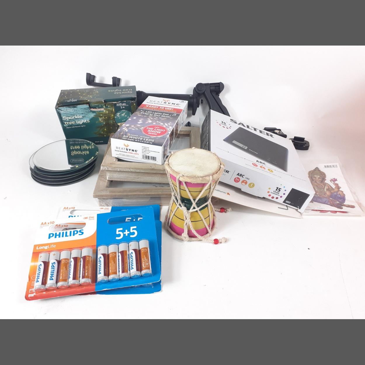 A gloriously mixed lot to include a set of 320 LED fairy lights, seven mirrored glass display coasters (15cm dia), an Indian hand drum, 2 washed wood effect deep box frames, 3 packs of rechargeable double A batteries, a selfie stick etc