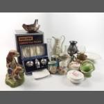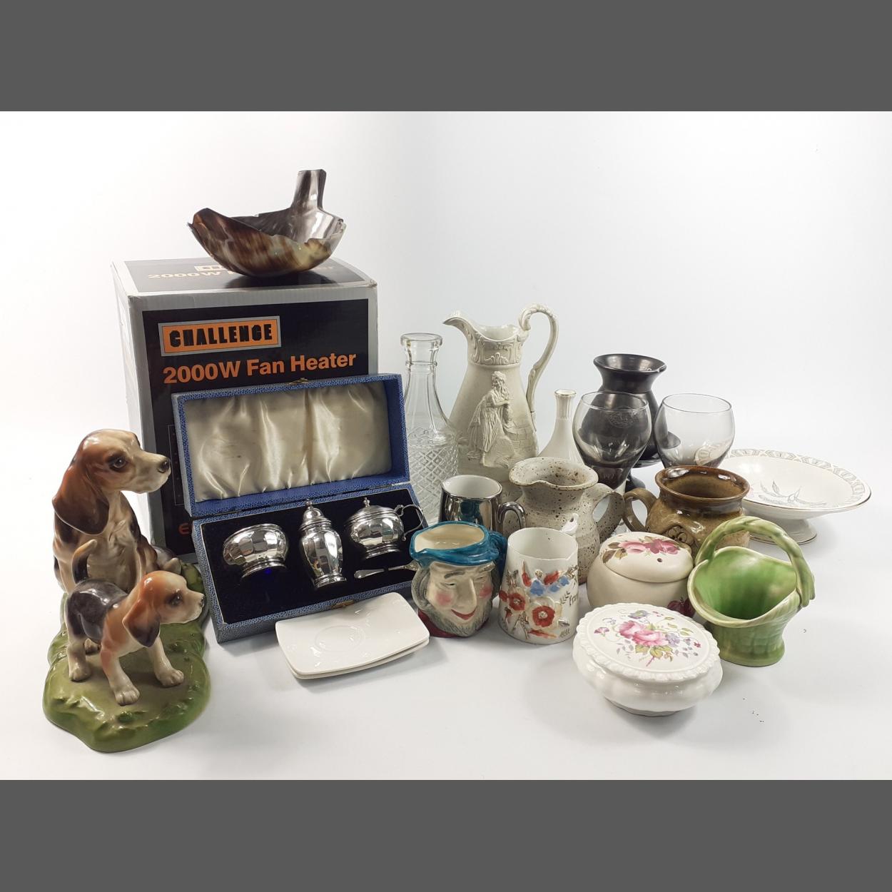 A mixed box to include a ROYAL WINTON tazza (16cm dia), a WEDGWOOD Hathaway Rose posy vase, an AXE VALE pottery pot pourri dish, a pottery ugly mug, a CULLODEN pottery tazza (11cm approx), a boxed cruet set complete with blue glass liners, 2 vintage smoked glass wineglasses, a Challenge 2000W fan heater,