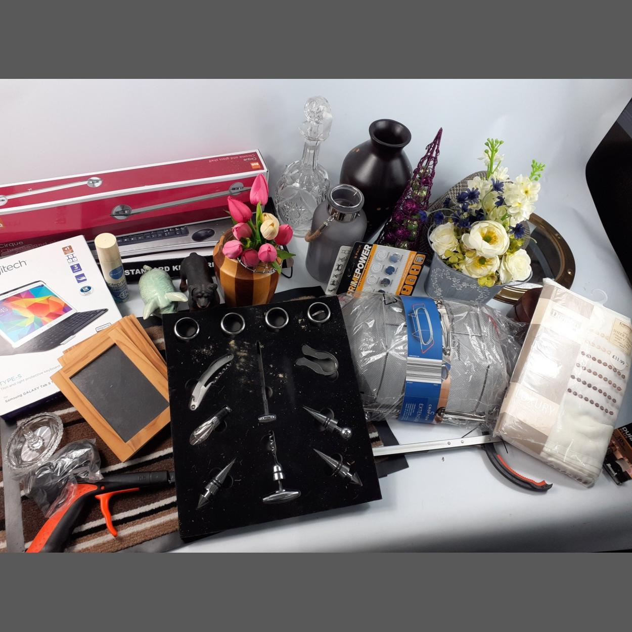 A truly mixed box to include a porthole mirror (31cm dia), a cut glass decanter (32cm tall), 2 doormats, a wood effect vase (28cm tall approx), a boxed chrome and glass shelf, a PLATOON standard keyboard and mouse (model: LK500), a LOGITECH type-S keyboard case for a Samsumg Galaxy Tab 5 and much, much more