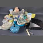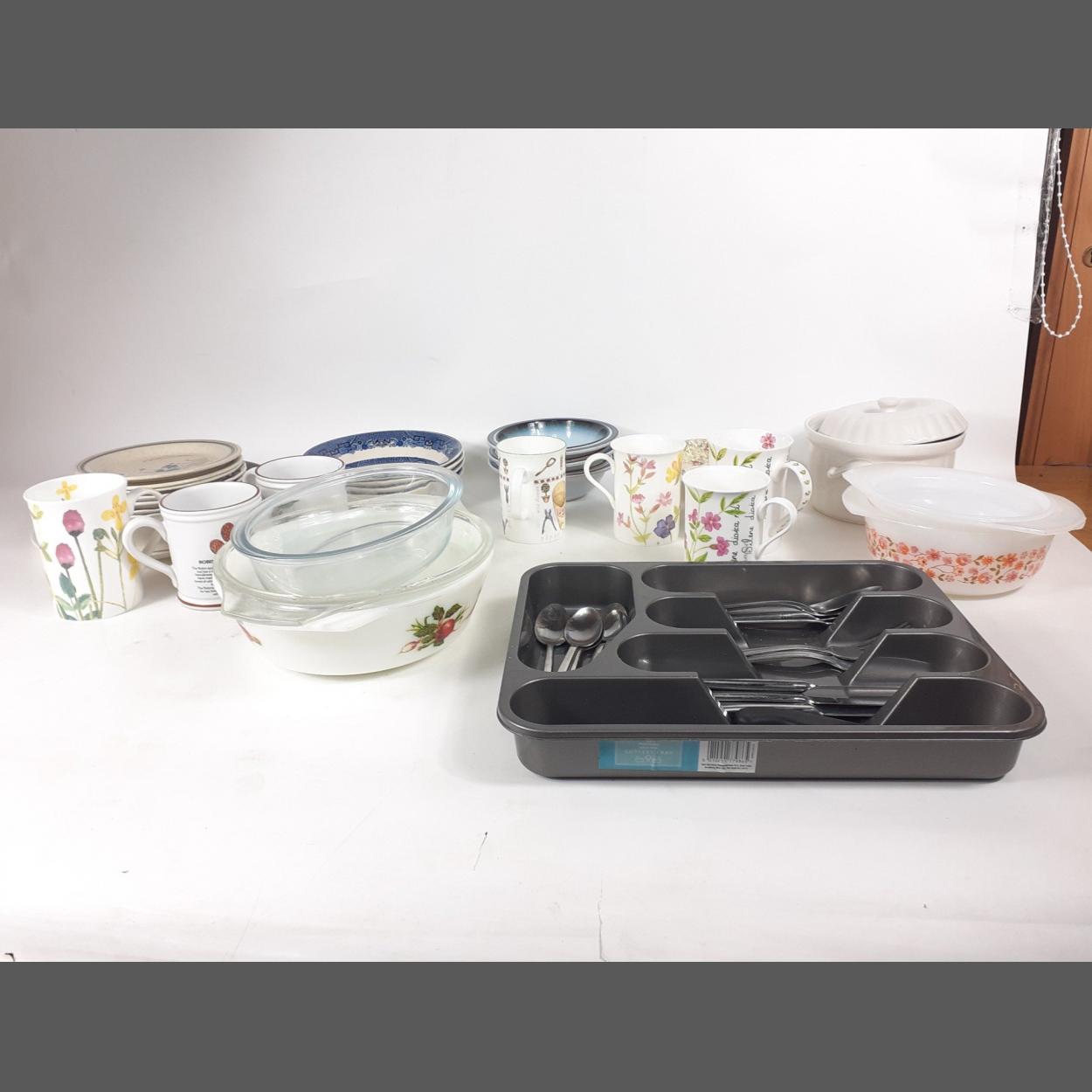 A mixed lot - maybe for a student setting up home? to include mugs by DENBY, PRICE & KENSINGTON and RAYWARE plus various plates and bowls including 3 bowls (16cm dia) by DENBY, 5 blue and white willow pattern bowls (1 with a chip to the rim) plus much more all contained within a blue 32L lidded storage box