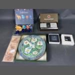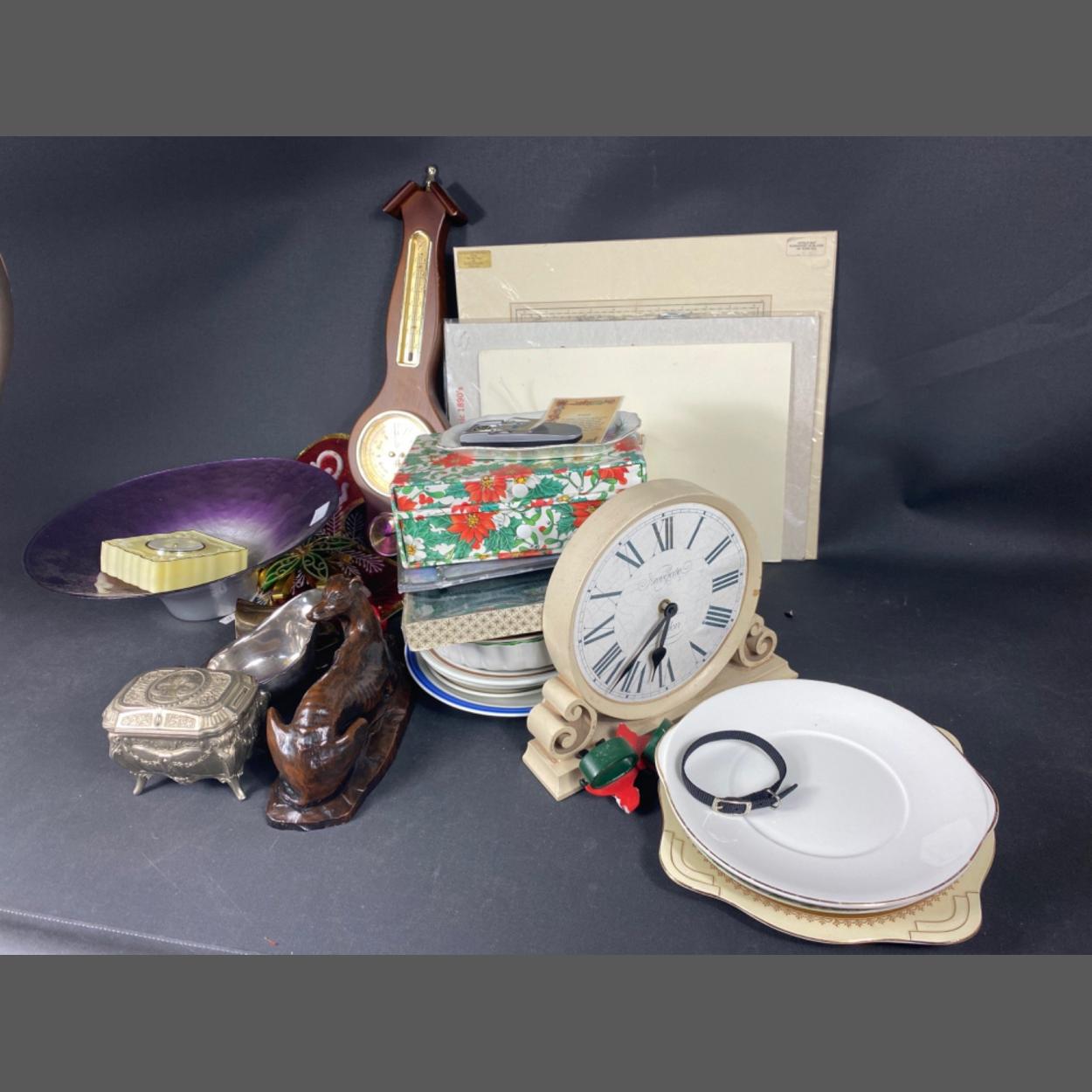 A mixed box to include a small stationery box with contents ( 23x18x8cm), decorative plates including the Rose Window, York Cathedral, Mary, Mary and little Bo Peep, a modern wall-mounted barometer/ thermometer, a white metal musical jewellery box from Rome (stands 10cm high), a LAURA ASHLEY Newgate mantel clock (23cm high), etc, etc