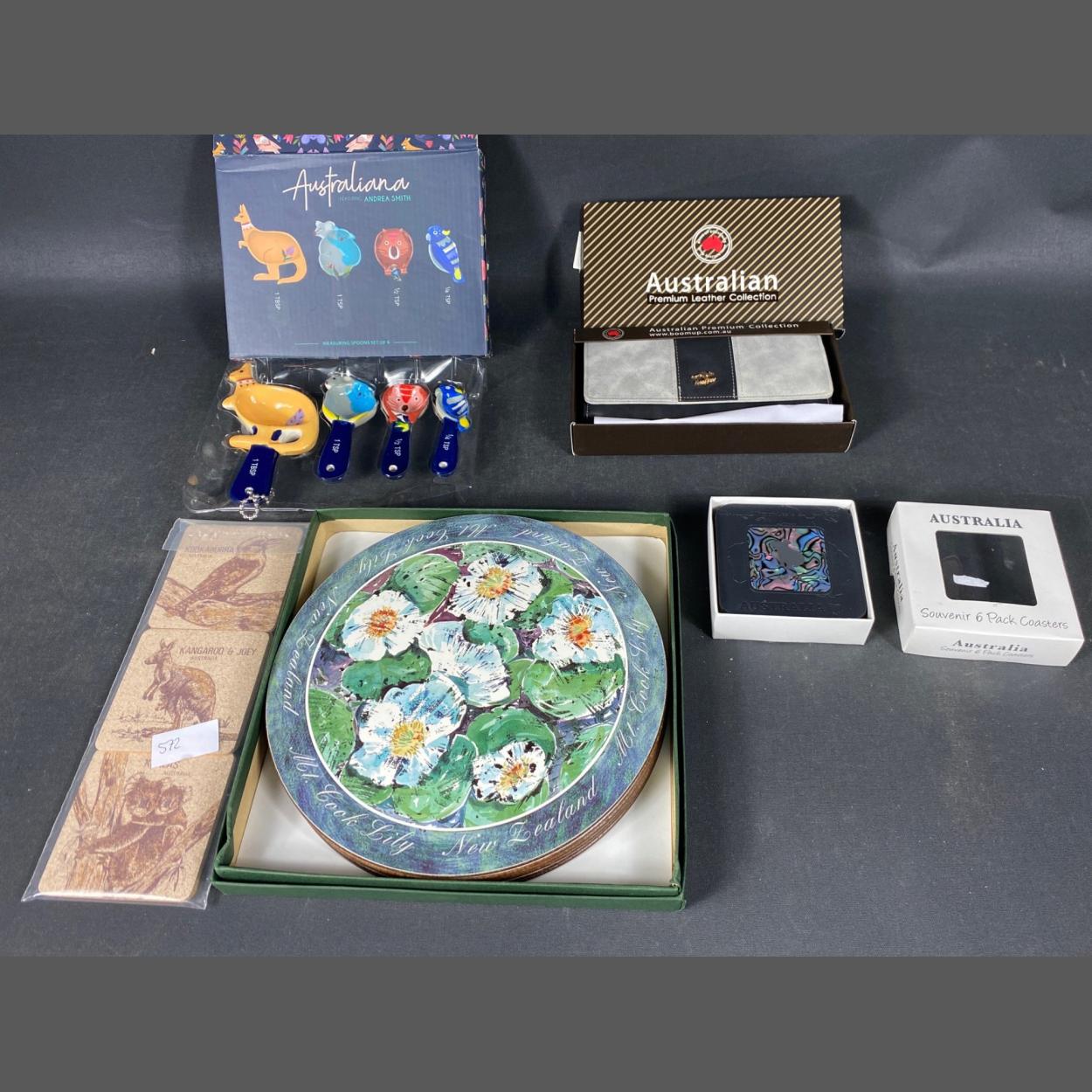 A set of six placemats from New Zealand with designs of native fauna, an Australian leather wallet in back and grey, a set of 6 cork coasters with Australian animals, a six-pack of Australian coasters with koalas, and a set of measuring spoons showing Australian animals