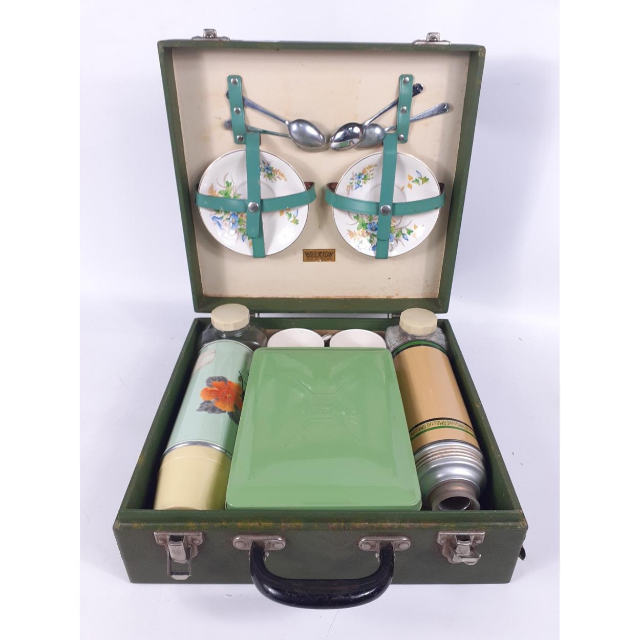 A vintage BREXTON picnic case including 2 cups, 4 saucers, 4 teaspoons, 2 vacuum flasks, one by THERMOS, 2 glass jars for sugar and tea and a tin for sandwiches