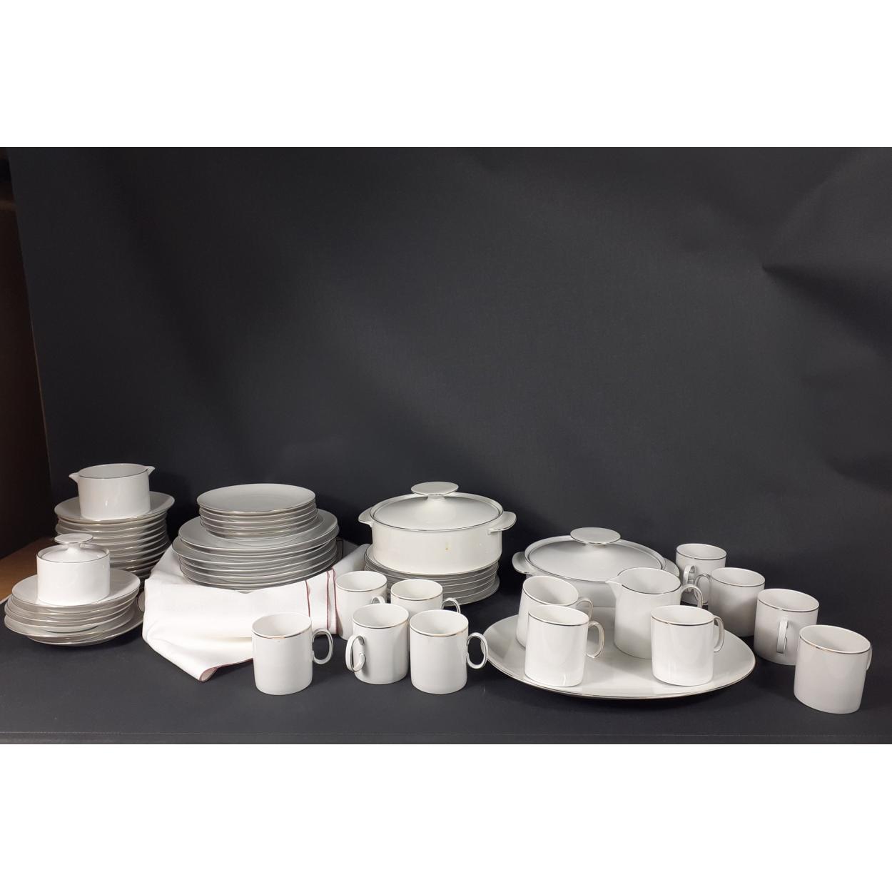 A smart THOMAS of GERMANY dinner service, white with a gilt trim, to include 12 cups, 12 saucers, 12 plates (17cm dia), 6 plates (21cm ), 7 plates (24cm), 1 sauceboat with underplate, 1milk jug, 1 sugar bowl, 1 ashet (34cm long approx), 2 lidded vegetable dishes ( 20cm dia approx) plus 6 napkins (white with red trim) and 11 cotton napkins (white with cut-out embroidery)