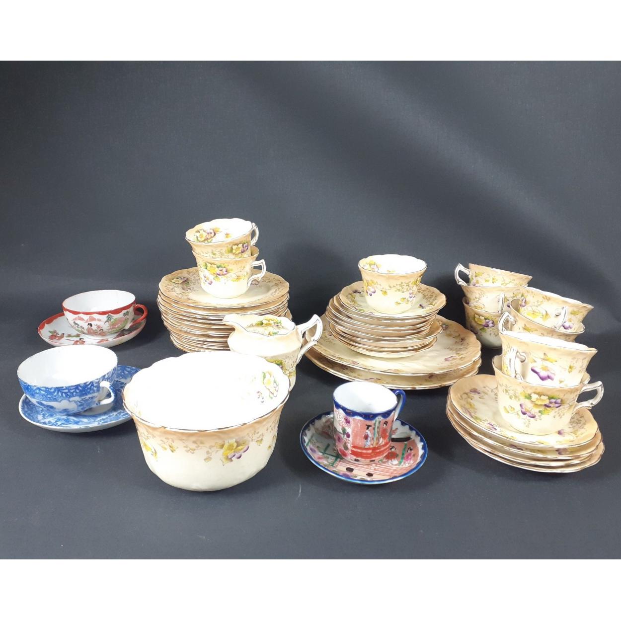 A BALMORAL floral patterned early 20th century 11 cup teaset with 12 saucers, 12 teaplates, 2 sandwich plates, sugar bowl and milk jug - 39 pieces - one cup has a historical hair-line crack otherwise in good condition plus a few pieces of Oriental cups and saucers etc